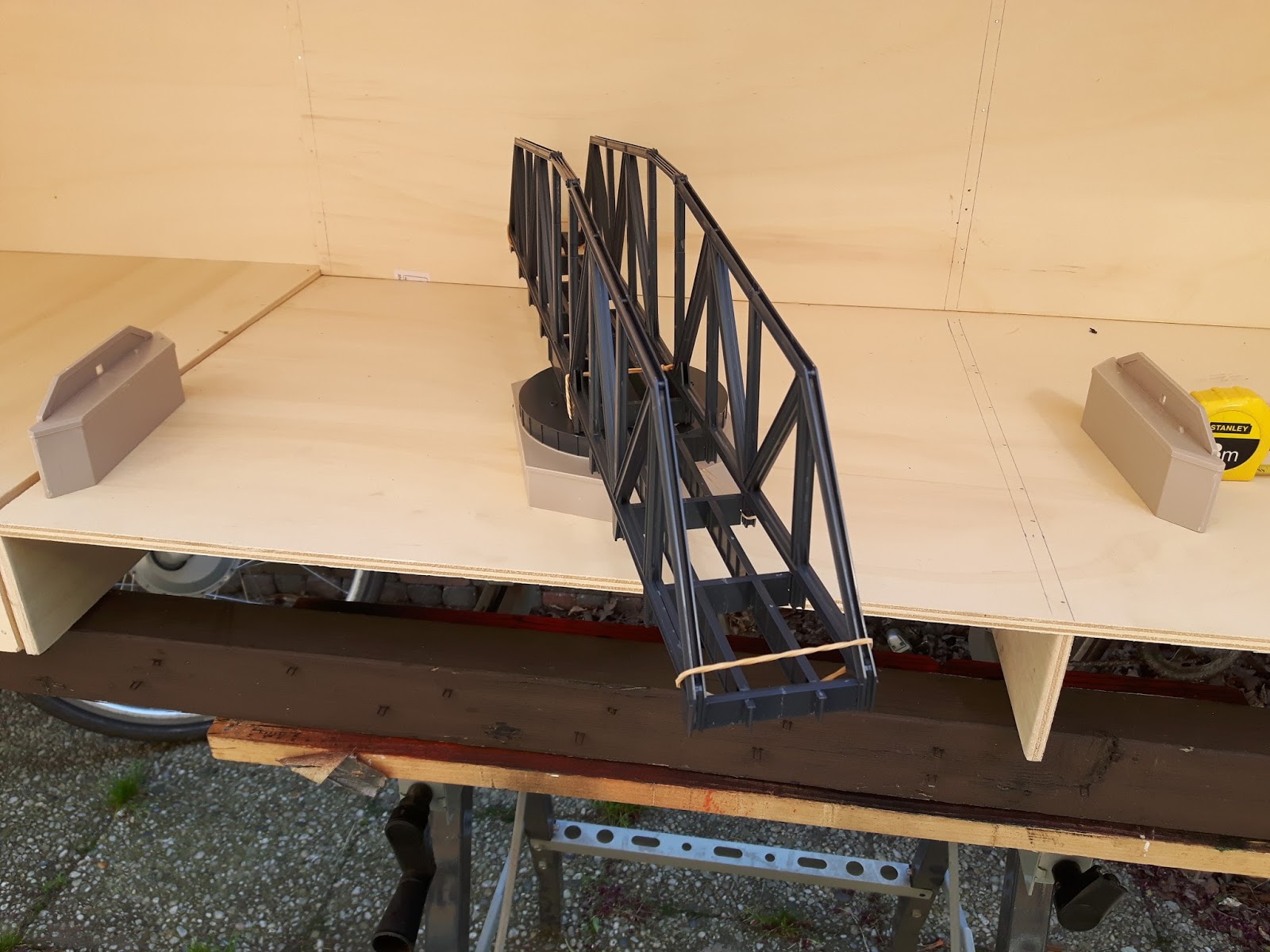 Now work starts with the bridge floor. It has to be made smaller from 2-track to one track. So the cross pieces has to be shortened with a saw: